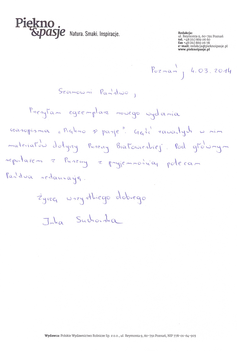 W naszej restauracji dostaną Państwo wyroby pasieki "Krainka"